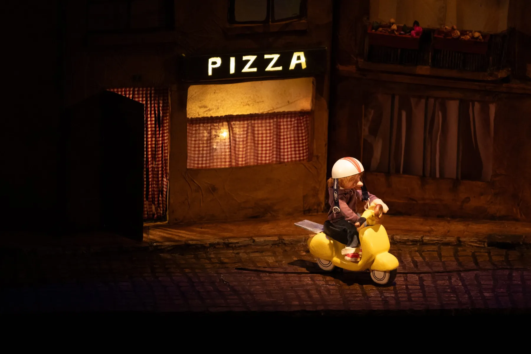 Des bâtisses tordues, des immeubles biscornus, une rue sombre qui les longe, une ambiance de songe, et par les fenêtres éclairées, des silhouettes se dessinent, passent et s’activent. Inspirée par l’ambiance des tableaux de Hopper, par les films fantastiques de Caro et Genet et les personnages des livres de Paul Auster, Magali Esteban imagine des histoires croisées dans une scénographie expressionniste et immersive animée. Le décor est le pivot entre ces figures lointaines qui prennent vie par des jeux d’ombre, de bruitage et de lumière. Il campe un quartier, une maquette urbaine miniature qui accueille une série de personnages pittoresques sous forme de marionnettes. Après Arrivederci et 3 Plumes, Faubourg joue du visible et du caché, de nos projections par imagination. Entre humour et mélancolie, il fait de nous des voyeurs occasionnels, des passants du soir qui lèvent le nez pour s’immiscer dans ces intimités closes.