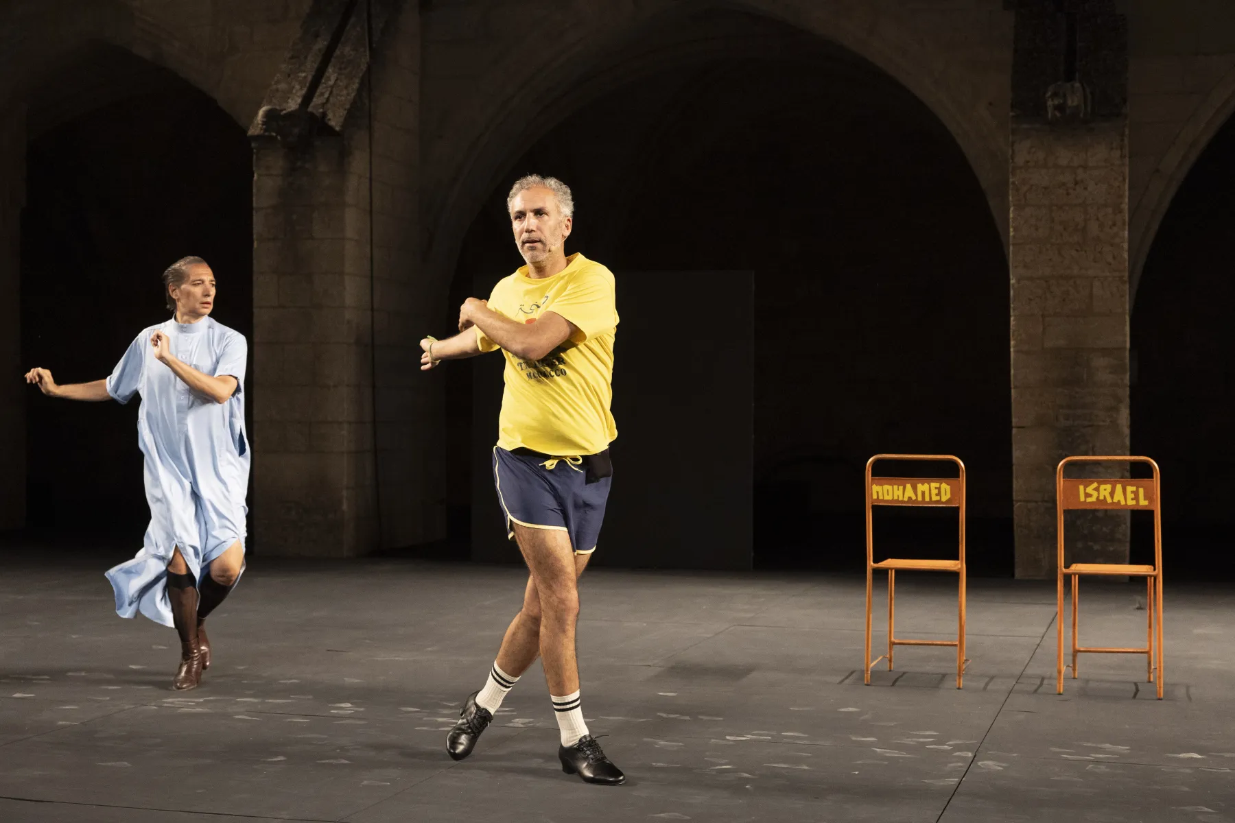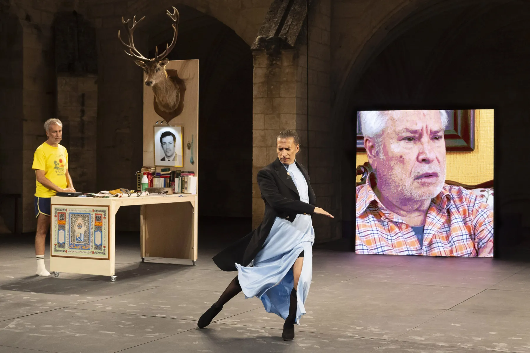 Ils ont en commun le goût du foot et de la scène. L’un danse, l’autre joue. Tous les deux fabriquent des formes scéniques uniques en leur genre. Israel Galván a le flamenco dans les jambes depuis l’enfance. Mohamed El Khatib pratique un théâtre du réel nourri de ses études de sociologie. Leurs parents sont très pratiquants mais ne prient pas le même Dieu. Ils ont reçu une éducation religieuse mais s’en sont affranchis. Ce sont des artistes libres et épanouis dans leur art. Mais force est de constater qu’ils se cachent encore pour fumer et qu’ils n’osent pas tout dire à leurs pères par peur de leur réaction. Israel et Mohamed ont décidé de réunir leurs affinités et leurs différences sur un plateau, de questionner en miroir leurs archives familiales et leur héritage culturel. Ce spectacle est leur point de rencontre, un espace rêvé qui réunit zone de confort et saut dans le vide. Un dialogue amical pétri d’humour. Une déclaration d’amour à leurs parents.